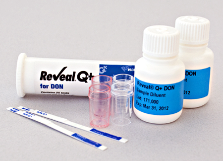 由 Neogen的側向流動測試讀數器精確顯示。DON係由黴菌所產生,常見於日用穀物如小麥,玉米和大麥 上。而黴菌毒素( mycotoxin)在實驗動物上具有毒理效應,有其 不同程度的影響。另外對加工食品中即食穀物中的風味與對生麵團品質有不利影響。