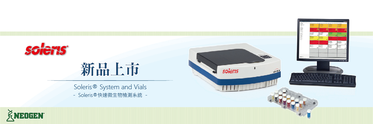 Soleris為一快速光學偵測系統,應用於微生物汙染檢測。當微生物生長且代謝養分時,此系統會藉由偵測 pH值與其他生化反應所產生的顏色變化來檢測微生物是否生長。機器亦可顯示出菌量超標的樣品。