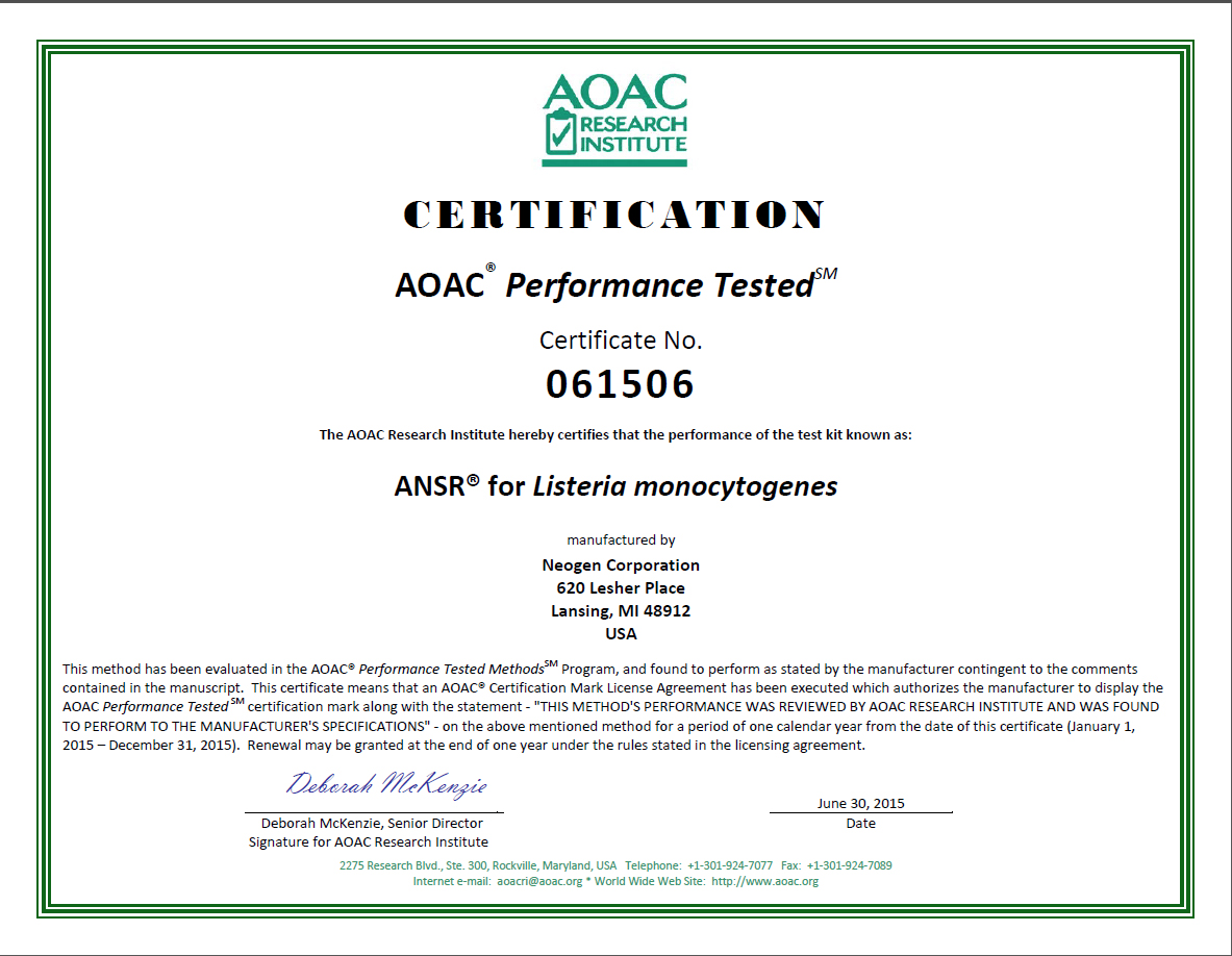 該認證涵蓋使用ANSR系統檢測以下樣品類型中的李斯特單核球增生菌:熱狗,墨西哥風格的奶酪,哈密瓜,鱷梨醬,巴氏消毒的液態蛋,芽苗灌溉用水和不銹鋼表面的海綿樣品。