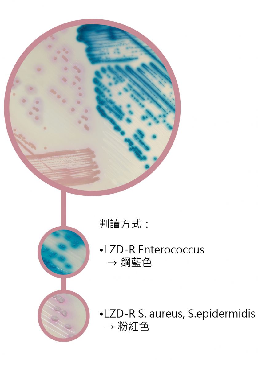 抗藥性革蘭氏陽性球菌的出現已對人類健康帶來了全球性的威脅。利奈唑胺(Linezolid)是一種對多種病源性革蘭氏陽性菌具有廣泛效力的抗生素,如MRSA、VRS及VRE皆可有效治療。然而,在利奈唑胺(linezolid)取得臨床應用的許可後,近期出現越來越多關於利奈唑胺抗藥性菌株(LIN-R)及cfr 基因水平轉移相關的抗藥性菌株的報導。 儘管目前利奈唑胺抗藥性菌株(LIN-R)的盛行率仍然很低,但 LIN-R 菌株的出現仍然是個很大的隱憂。現今,臨床檢體中的利奈唑胺抗藥性革蘭氏陽性菌主要是由歐洲和美國的監視計劃進行監測,而取得臨床 LIN-R 菌株的方式包括鼻拭子(用於篩查葡萄球菌)、肛周和直腸區域(用於篩查腸球菌)。 CHROMagar™ LIN-R 是一種篩選用呈色培養基,用於檢測、分離和鑑別具利奈唑抗藥性的葡萄球菌和腸球菌菌株。 |