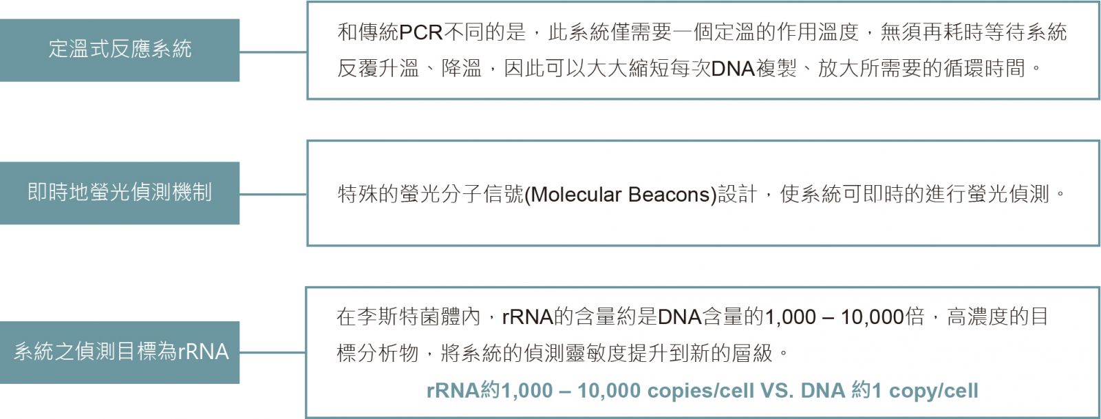 ANSR 全名為Amplified Nucleic Single Temperature Reaction,又作「新型定溫式核酸增幅反應系統」,本系統以獨家專利技術進行rRNA的增幅反應。不同於傳統的PCR,ANSR不需要反覆升溫、降溫的步驟,本系統的反應溫度全程維持定溫56℃,並在此溫度下進行rRNA的複製、增幅與放大。因此ANSR可快速放大目標微生物的特定rRNA片段。