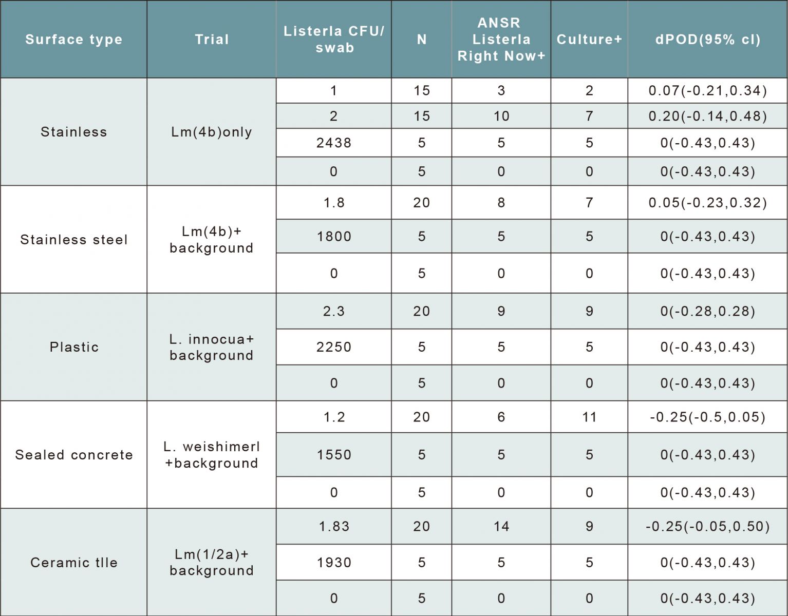 包含具致病性的單胞多核性李斯特菌(L. monocytogenes)。 Listeria Right Now已獲美國國家衛生基金會(NSF International)的認證,比起其他市售產品,本系統的偵測敏感度更高,比起傳統法,可更快速、有效地檢測出環境中微量但存在的李斯特菌。