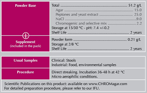 產品說明: 科瑪嘉 彎曲桿菌 培養基 科瑪嘉 CHROMagar Campylobacter 用於檢測耐熱性Campylobacter 菌落典型外觀 Campylobacter jejuni,Campylobacter coli, Campylobacter lari→紅色 其他細菌→藍色或抑制 |