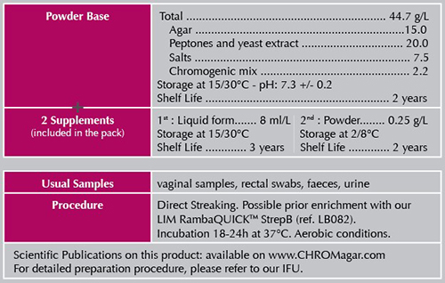 Gain flexibility using powder rather than ready to use plates: Use the entire pack, or just a portion if there is a need for a smaller number of plates,. If kept under appropriate storage temperature, CHROMagar StrepB has about 2 years of shelf life. This flexibility is essential to avoid the waste resulting from expired-unused plates.