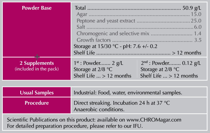 Gain flexibility using powder rather than ready to use plates: Use the entire pack, or if there is a need for a smaller number of plates, just a portion. If kept under appropriate storage temperature, CHROMagarTM C.perfringens has more than 12 months shelf life. This flexibility is essential to avoid the waste resulting from expired-unused plates.