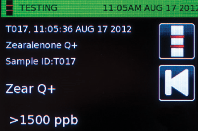 | Reveal Q+ for Zearalenone 是一種基於競爭性免疫分析形式的單步側向流動免疫色譜分析。提取物通過試劑區被吸走,該試劑區含有與膠體金顆粒結合的玉米赤黴烯酮特異性抗體。如果存在玉米赤黴烯酮,它將被顆粒抗體複合物捕獲。然後將玉米赤黴烯酮-抗體-顆粒複合物吸到膜上,該膜包含與蛋白質載體結合的玉米赤黴烯酮區域。該區域捕獲任何未復合的玉米赤黴烯酮抗體,使顆粒集中並形成可見線。隨著樣品中玉米赤黴烯酮水平的增加,游離的玉米赤黴烯酮會與抗體-金顆粒複合。這允許在測試區域中捕獲更少的抗體金。因此,隨著樣品中玉米赤黴烯酮濃度的增加,測試線密度降低。 |