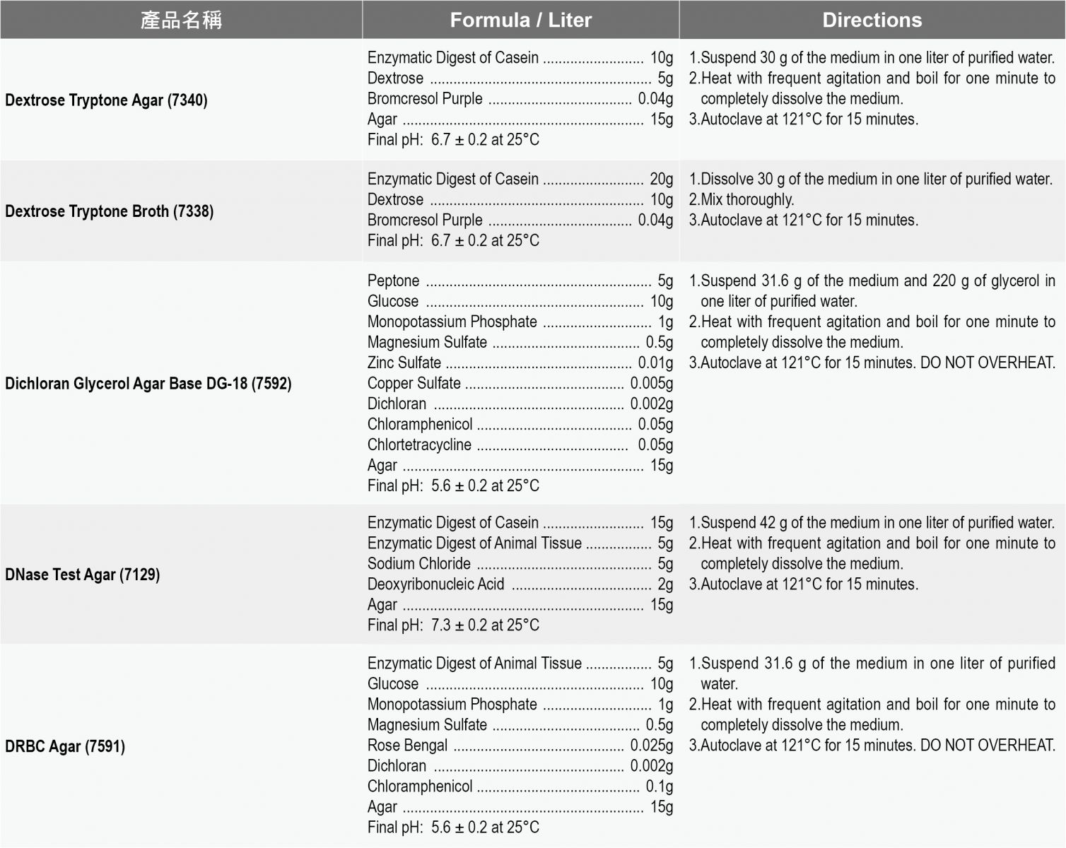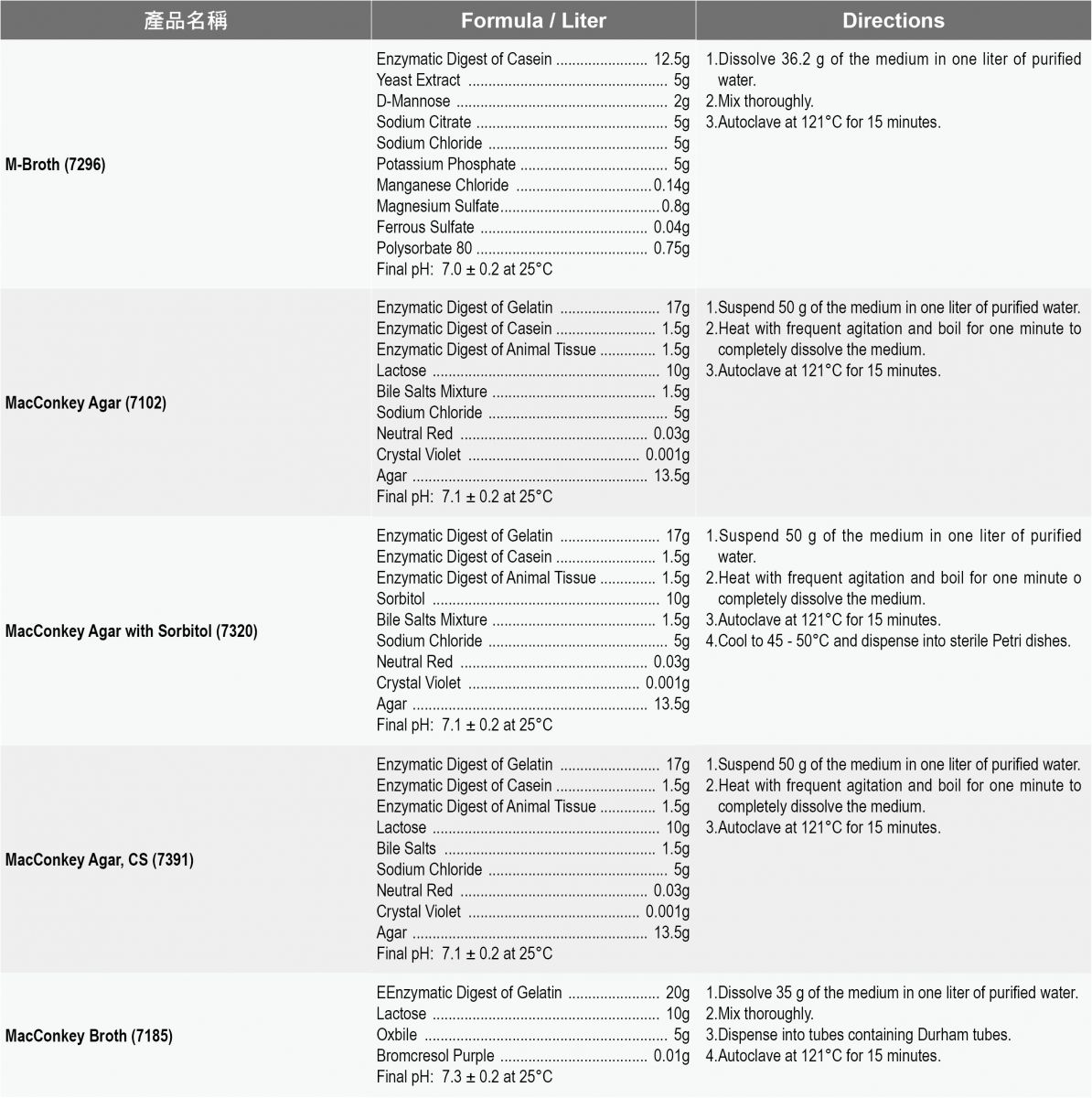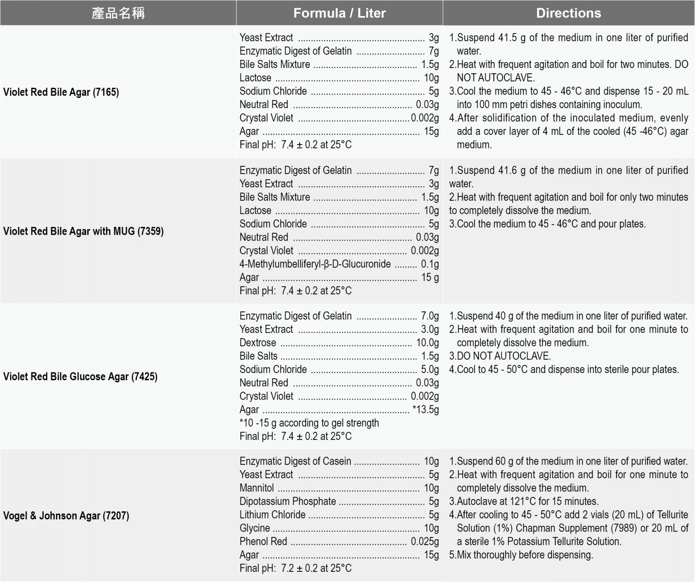 產品說明: Acumedia食安品管粉末培養基 1.各式食品乳品品管用TFDA, FDA, ISO微生物級培養基。 2.針對總生菌,總大腸桿菌群,總黴菌酵母菌計數培養基與病原菌 Acumedia 種類齊全是您最佳選擇!! |