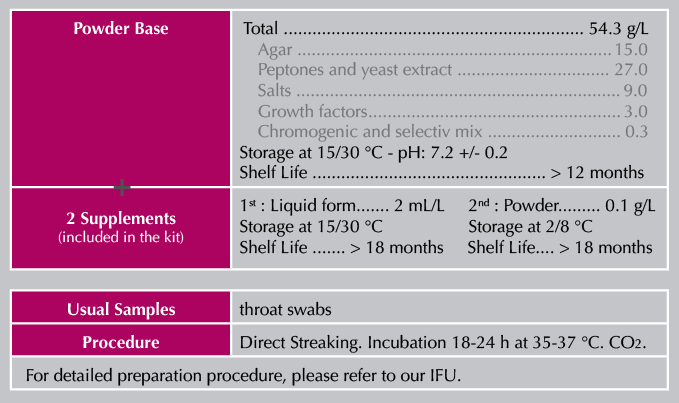 CHROMagar™ StrepA 鏈球菌是一種新的呈色基質配方,可以在咽喉檢體複雜菌群中,輕易地由顏色直接判定,病原性A群鏈球菌(GAS)菌落(由橙色到紅色)或其他鏈球菌(無色或藍色菌落)。