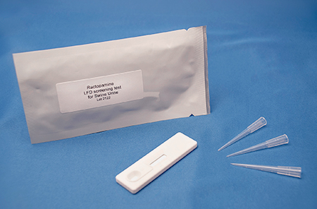 The Ractopamine lateral flow device (LFD) is designed solely for use in preliminary screening of undiluted swine urine samples. It is a competitive inhibition immunoassay for the qualitative detection of Ractopamine. The Ractopamine LFD provides only a preliminary qualitative analytical test result. Professional judgment should be applied to any test results, particularly when preliminary positive or negative results are used. LC-MS/MS is recommended as the method of choice for confirmation of positive results obtained with the Ractopamine LFD.