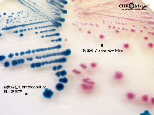 傳統培養基像 CIN (Cefsulodin Irgasan Novobiocin) agar,致病性和非致病性生物型極為相似。但在CHROMagarTM Y.enterocolitica培養基,致病性Y. enterocolitica以特別的紫紅色菌落,而非致病性則以金屬藍色菌落生長,判定一目了然。