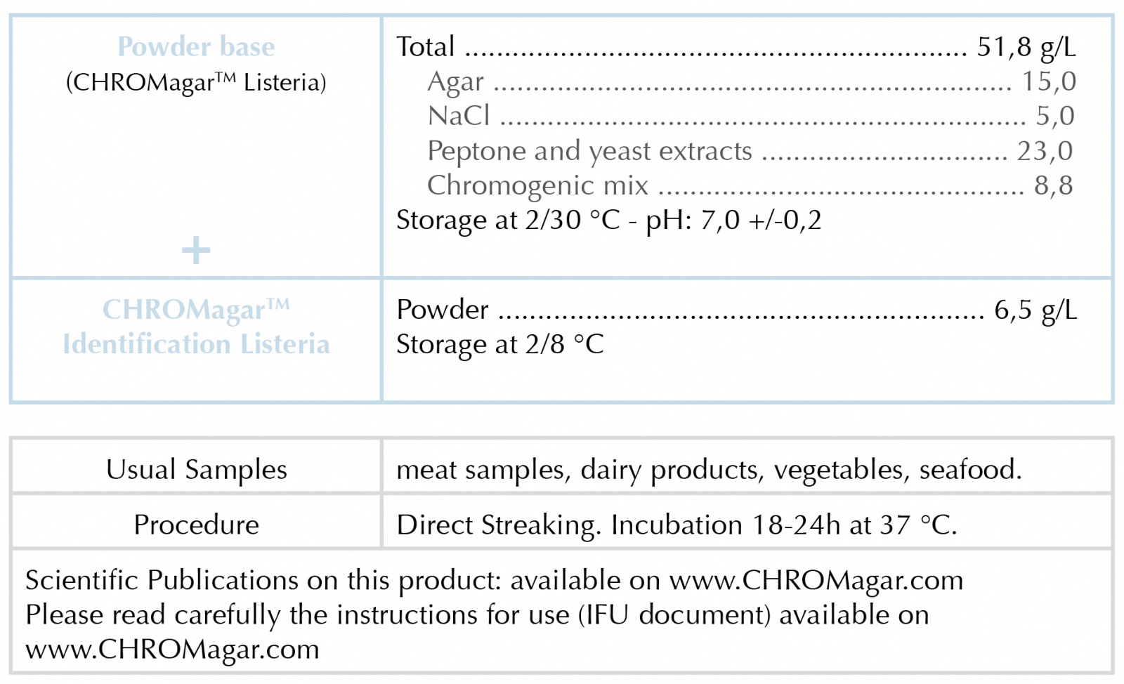 由於單核細胞增生李斯特菌和無害李斯特菌具有相似的生化特性,因此無法在傳統培養基(Palcam,Oxford)上區分它們。CHROMagar™ Listeria有助於直接在分離步驟中輕鬆區分單核細胞增生李斯特菌和其他李斯特菌:由於特定的磷脂酶活性,菌落呈藍色並被白色光暈包圍。