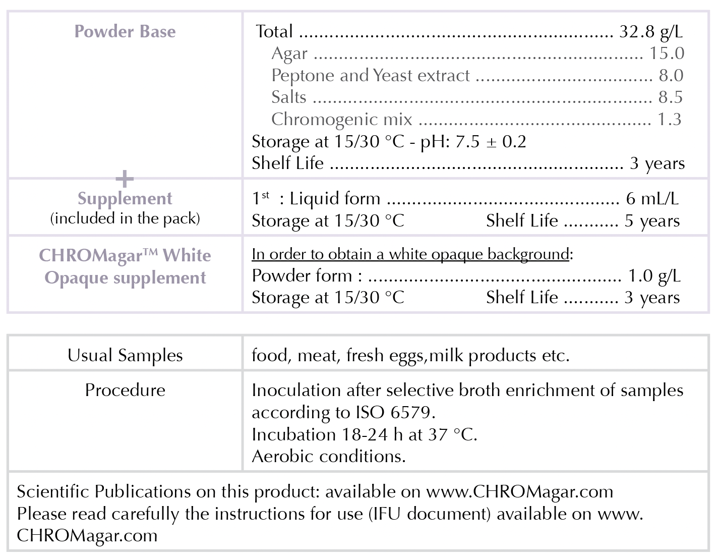 *Specificity and sensitivity from scientific study: “Evaluation of a new chromogenic medium CHROMagarTM Salmonella Plus for the detection of Salmonella species including lactose positive Salmonella, S.Typhi and S.Paratyphi” de Beaumont C., Breuil J., Dedicova D., Tran Q. 2006. Poster presented during ECCMID meeting.
