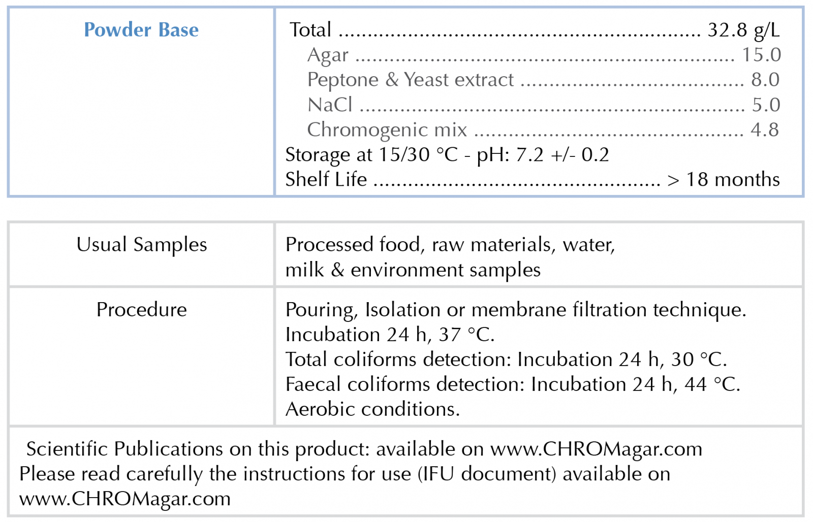 用於水、食品及環境樣品中,同時檢測和計數大腸桿菌和其他大腸桿菌。
