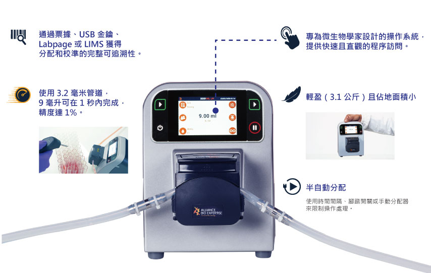 DOSYWEL UP! 是一款多功能、小巧的蠕動幫浦,提供快速且精確的液體灌裝方式。這款設備可以以 +/- 0.6 毫升的精度填充 9 毫升液體!