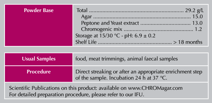 產品說明: 科瑪嘉 CHROMagar 大腸桿菌 O157 培養基 應用於食品和動物樣品中,分離與鑑定大腸桿菌O157。 微生物典型顏色外觀 大腸桿菌O157 → 紫紅色 其他細菌 → 鋼藍色,無色或抑