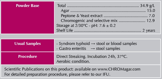 產品說明: 科瑪嘉 沙門氏桿菌 培養基 科瑪嘉 CHROMagar Salmonella 應用於臨床檢體來檢測和分離沙門氏菌屬, 包括 S. Typhi 和 S. Paratyphi。 微生物典型菌落外觀 Salmonella → 紫紅色 其他細菌 → 藍色,無色或抑制。 |