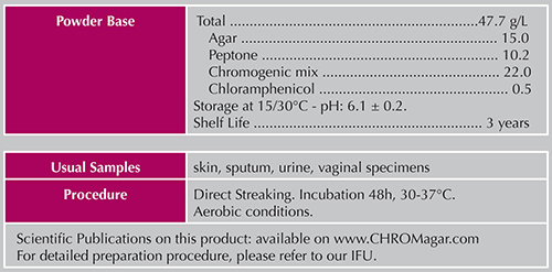 Please refer to our IFU and Material Safety data sheet for complete information about the medium. CHROMagar™, Rambach™, AquaCHROM™ are trademarks created by Dr. A. Rambach.
