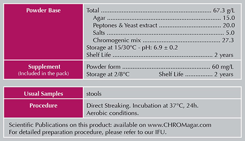 培養基配方 Gain flexibility using powder rather than ready to use plates: Use the entire pack, or just a portion if there is a need for a smaller number of plates. If kept under appropriate storage temperature, CHROMagar VRE has a 2 years shelf of life. This flexibility is essential to avoid the waste resulting from expired-unused plates. In the USA: For Research Use Only