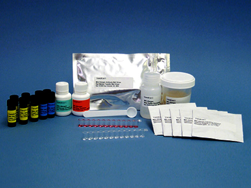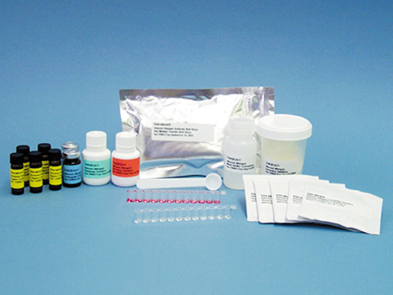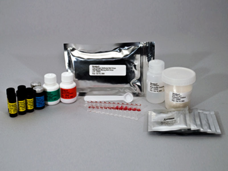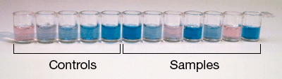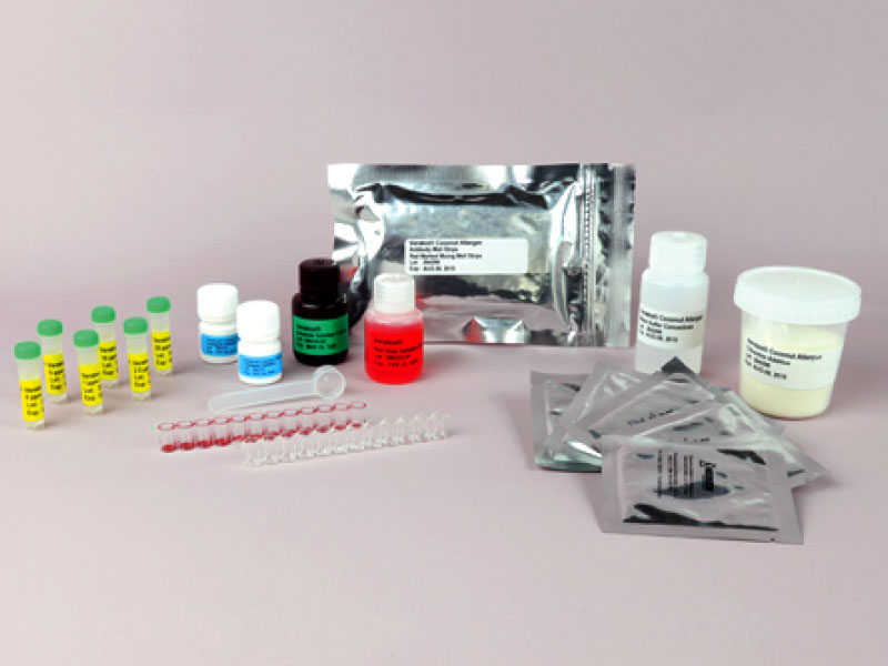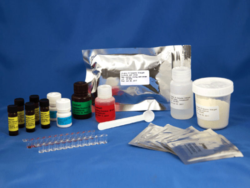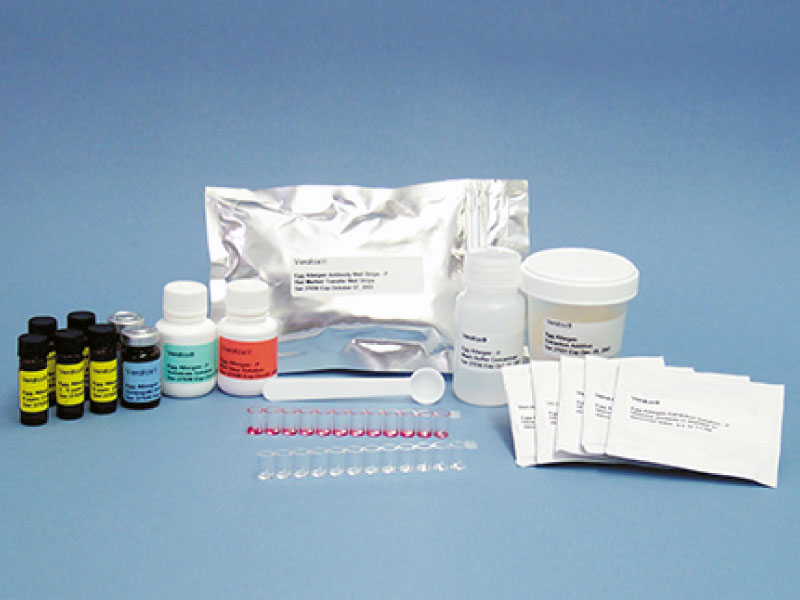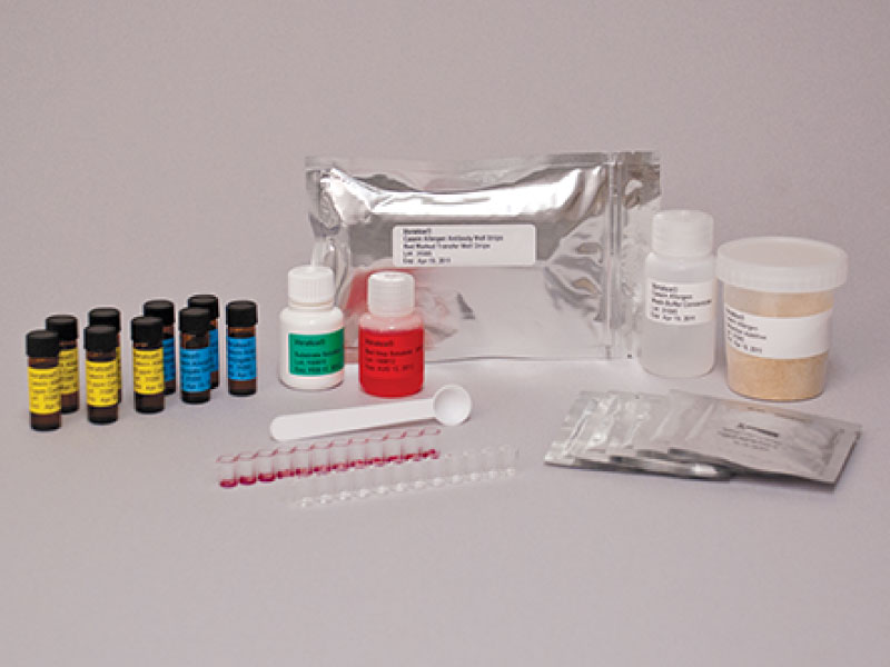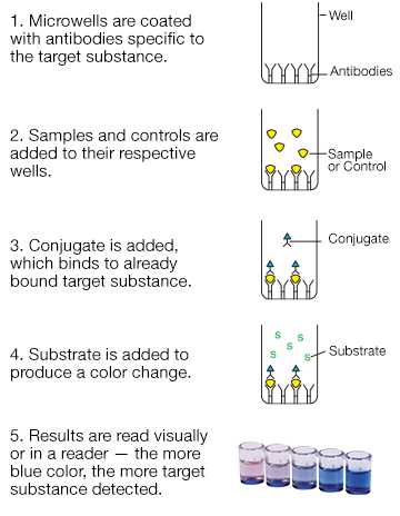 Each test kit contains antibody-coated wells with antibodies specific to the kit’s target substance. First, samples and controls are added to their respective wells. During an incubation, the target substance binds to the antibodies. The wells are washed to remove all unbound materials. An enzyme conjugate (antibody chemically linked with an enzyme) is added to all wells. During an incubation, conjugate binds to the already bound target substance, forming a “sandwich.” The more target substance in the wells, the more conjugate that binds in the wells. The wells are washed again to remove all unbound conjugate. A substrate, which changes color in the presence of the conjugate, is added to the wells. During an incubation, color develops in proportion to the amount of conjugate in the wells.