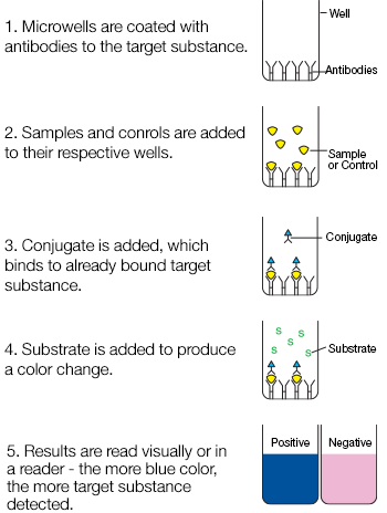 First, samples and controls are added to their respective wells. During an incubation, the target substance binds to the antibodies. The wells are washed to remove all unbound materials.