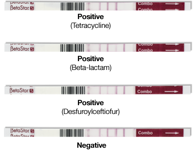 BetaStar® S Combo is an assay for the rapid detection of beta-lactam and tetracycline antibiotics in raw, commingled cow milk at or below established Maximum Residue Levels (MRL). The test utilizes a separate test line to detect the sum of the parent drug ceftiofur (a beta-lactam) and its metabolites.